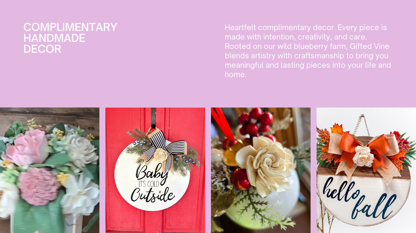 Inspired by nature and the simple beauty of farm life. From timeless wedding florals to custom home accents, every piece is made with intention, creativity, and care. Rooted on our wild blueberry farm, Gifted Vine blends artistry with craftsmanship to bring meaningful, lasting pieces into your life and home.