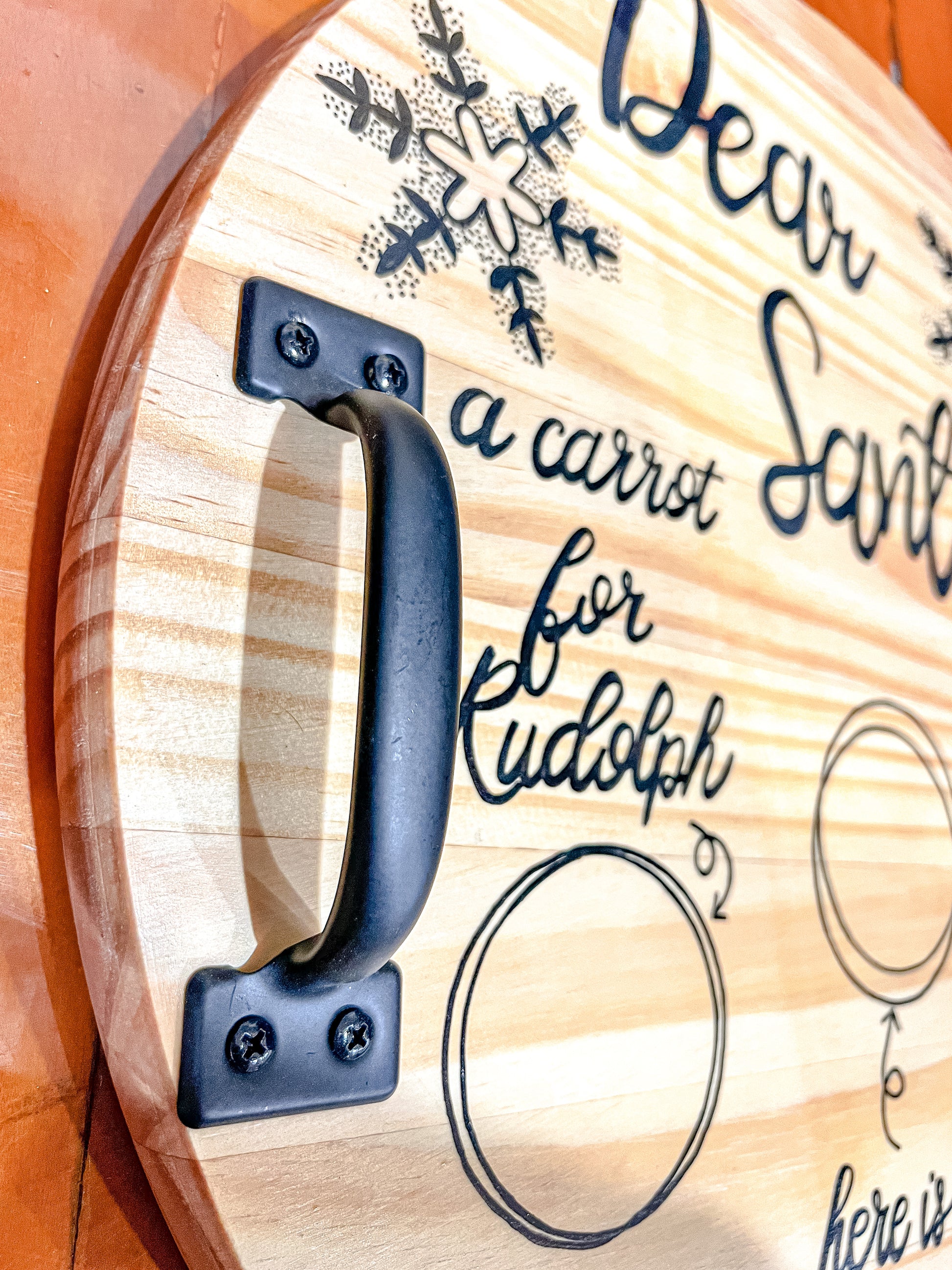 Hand stained and hand lettered cookie tray made out of an 18 inch round pine board. It is just about 1inch thick and has black handles. Add to the magic of Christmas with these gorgeous trays! Each one is made to order and can come in natural with black lettering or white with black lettering.